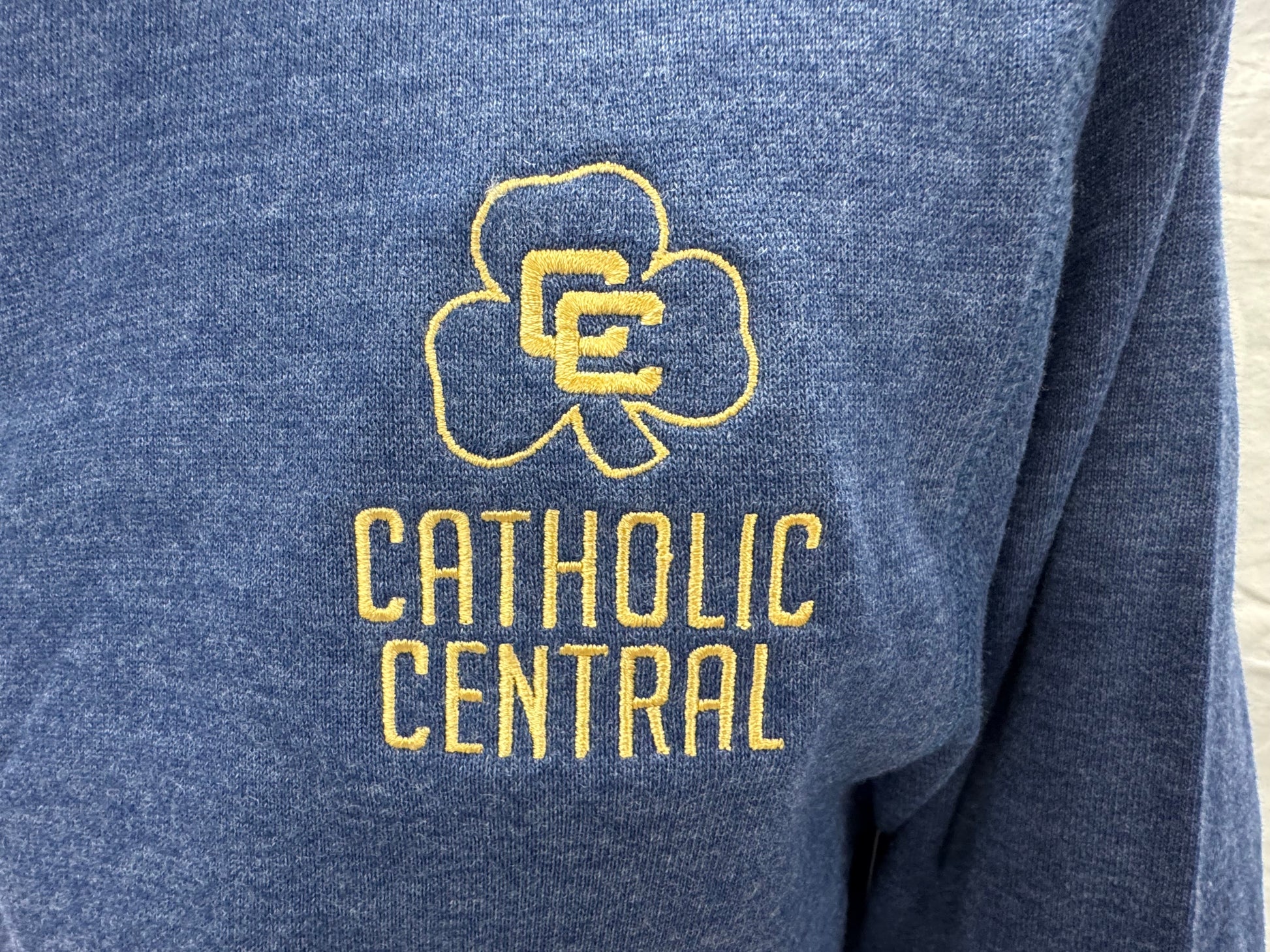 A blended fabric of cotton and French terry, this 1/4 zip is a midweight piece that is great for a second layer for school days. The tortoise shell buttons and fabric placket make this piece unique. The navy heather shows off an embroidered design in a rich CC gold color.