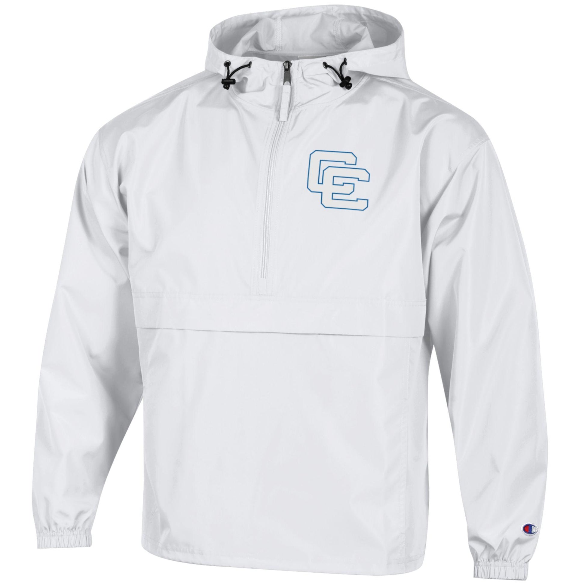 A lightweight water and wind resistant jacket that can be packed into its own pocket. An outlined CC is printed on the left chest as a simple but sharp detail.