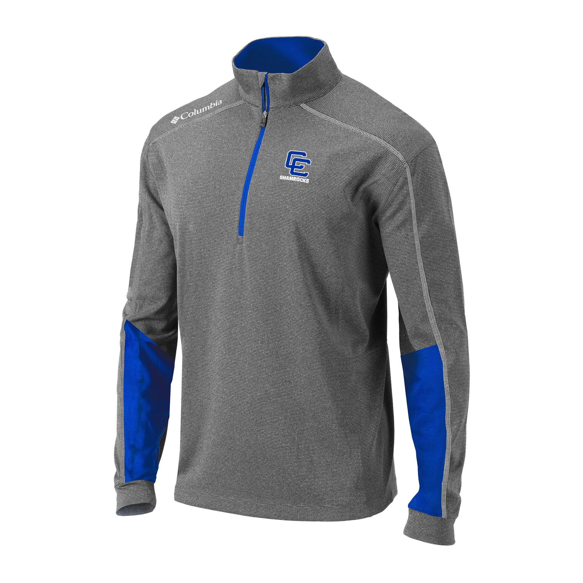 This piece from Columbia is 100% poly and has a colorblock styling with stitching detail down the shoulders and sleeves. The heathered gray background shows off a two tone CC SHAMROCKS embroidered design on the left chest.