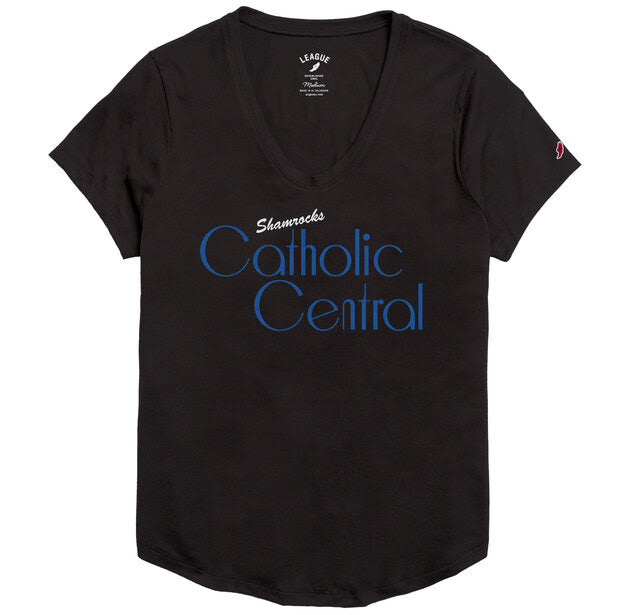 This poly/rayon/spandex ladies tee has a soft feel and flattering relaxed shape. It has a V-scoop neckline and a curved hem lending to a more feminine look. The black color shows off a modern and fun, two tone printed design featuring CATHOLIC CENTRAL in royal blue and a script Shamrocks in white.