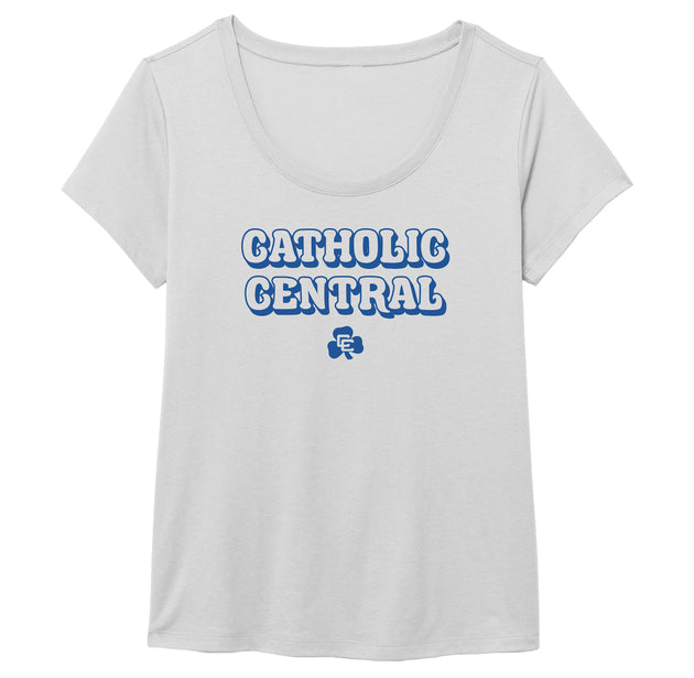 This soft 50/50 fabric hangs nicely and is preshrunk. The scoop neck and more feminine short sleeve makes it a nice look for the ladies of CC featuring a fun and funky throwback font for the artwork on the front in royal blue.