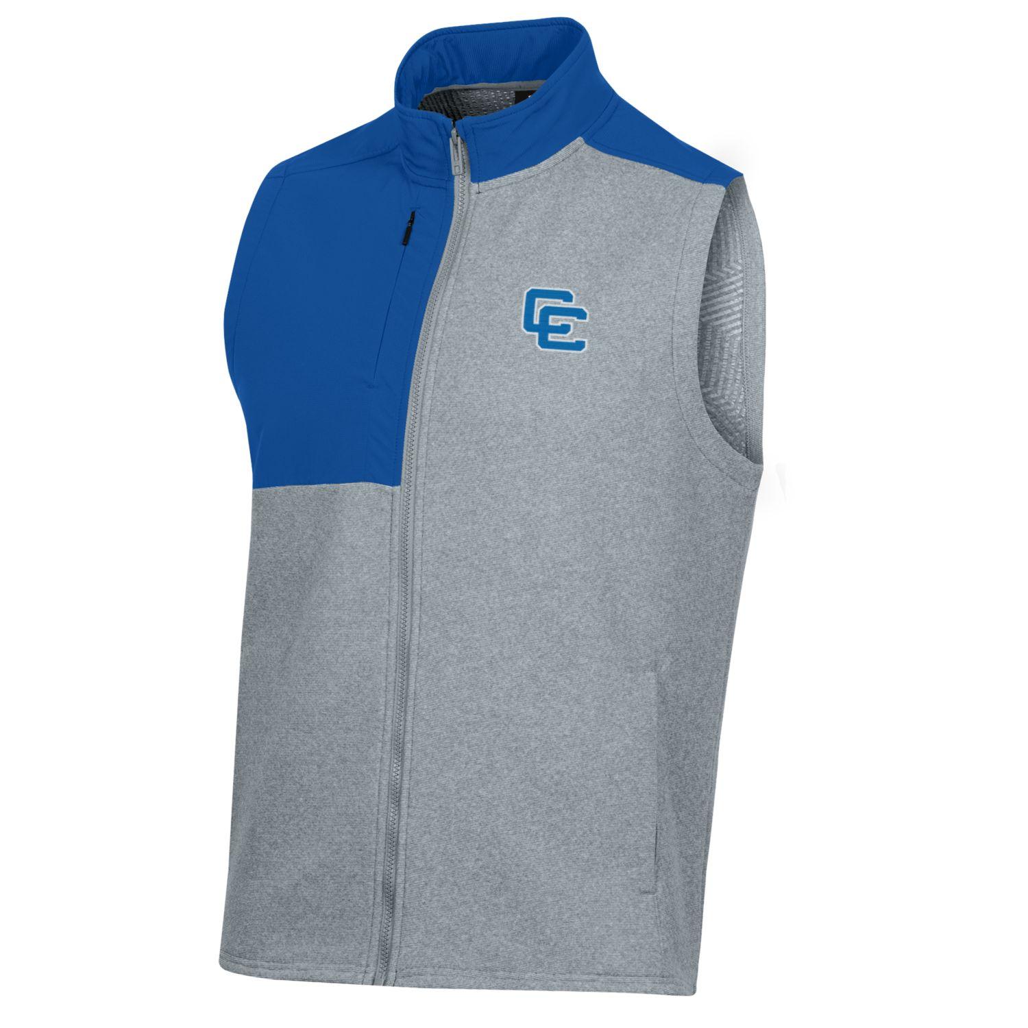 This polyester fleece vest is super soft and has "ColdGear Infrared technology using a thermo conductive coating to absorb and retain body heat". The color block style has a hidden zippered pocket at the right chest and side seam pockets. It features an embroidered two tone CC.