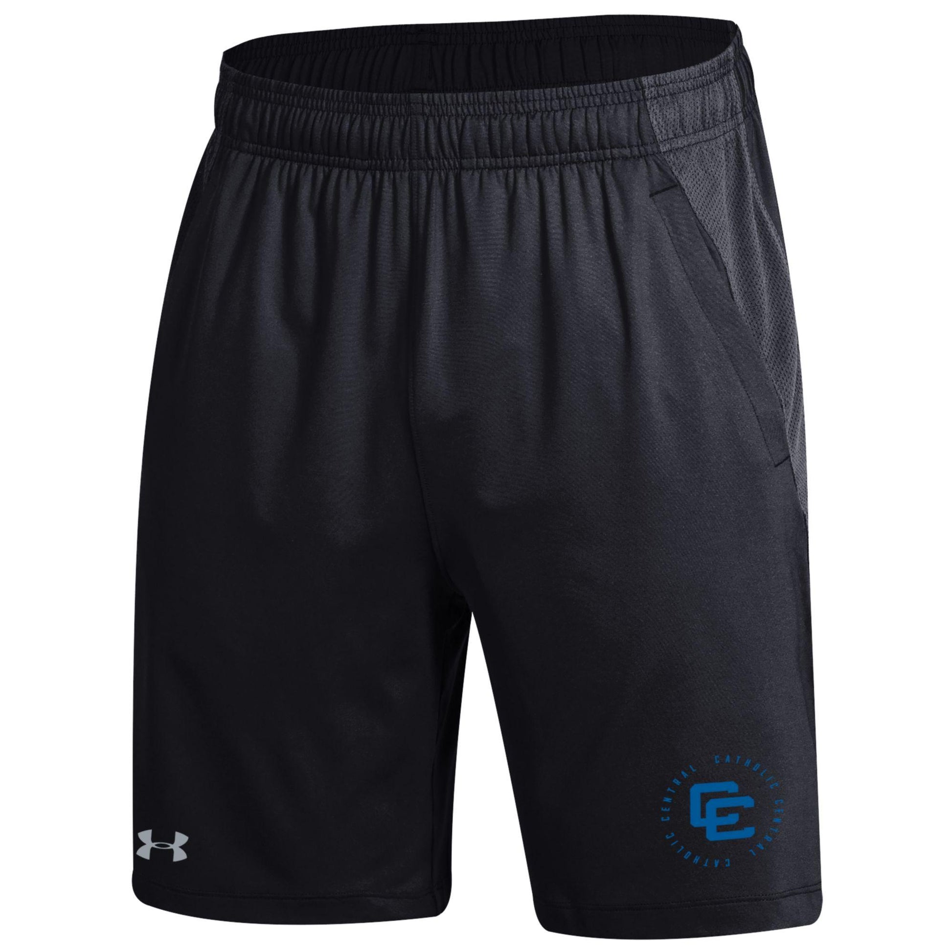 This 100% poly short with mesh inserts for breathability and moisture wicking has side pockets and an internal draw cord to adjust fit. The black shows off a royal blue design on the left leg. 8" inseam