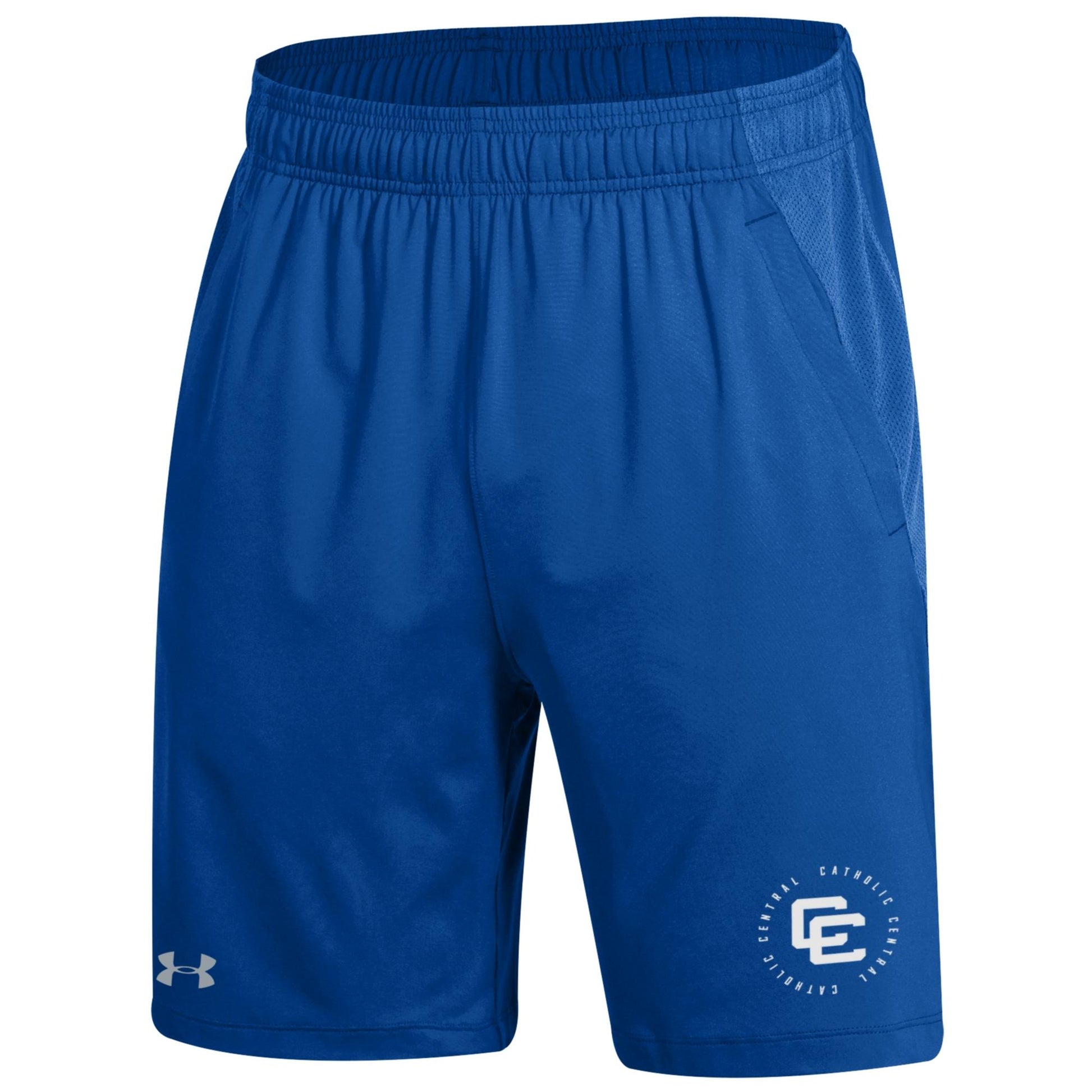 This 100% poly short with mesh inserts for breathability and moisture wicking has side pockets and an internal draw cord to adjust fit. The black shows off a white design on the left leg. 8" inseam